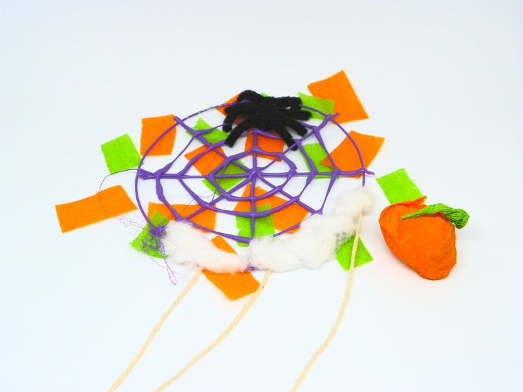 Como podéis ver, es una manualidad muy sencilla de hacer que podemos diseñar a nuestro gusto. Además, hemos añadido unas pequeñas arañas hechas con limpiapipas que dan un aspecto más terrorífico a nuestro atrapasueños para Halloween.