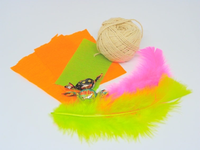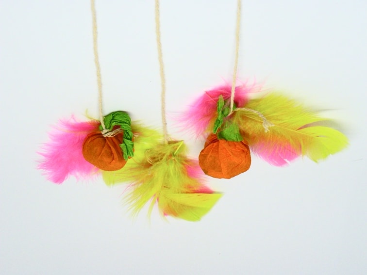 Recortamos unos cuadrados de papel y en su interior metemos los caramelos. Luego envolvemos con varias capas de papel naranja y en la parte superior enrollamos un trocito de papel verde que hará de cordón y del cual podemos anudar la cuerda para que queden colgando de las tiras con plumas.