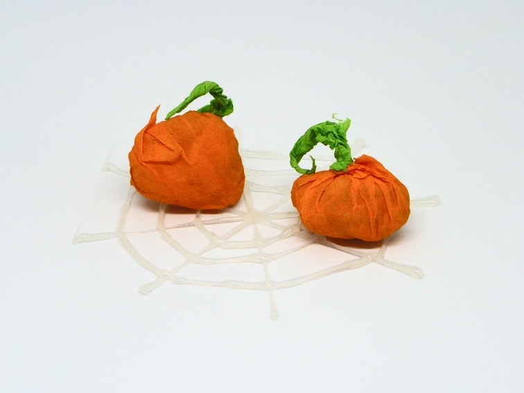 Estas pequeñas calabazas llevan en su interior unos cuantos caramelos. Para hacer esta pequeñas calabazas necesitamos papel crespón de color naranja y verde y la forma de hacerlas es muy sencilla.