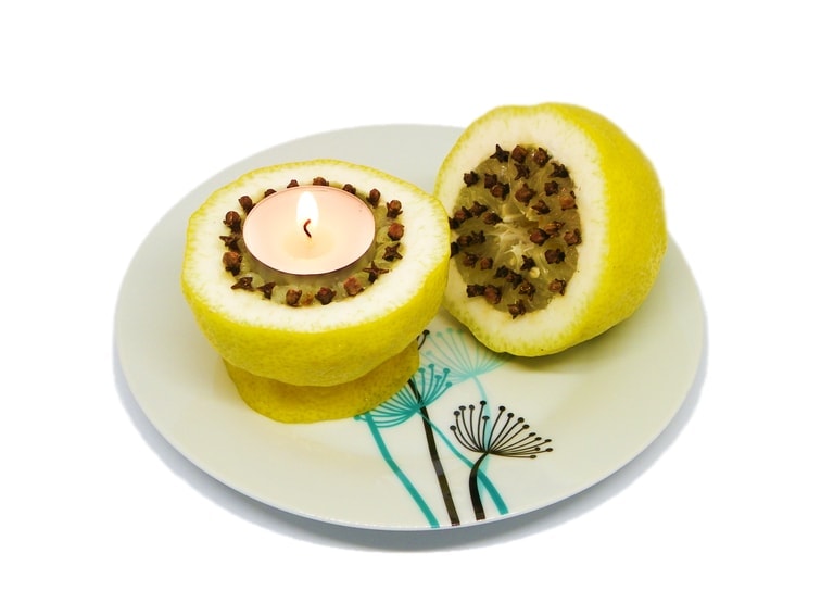A continuación, por el resto de vulva que queda del limón, vamos poniendo el clavo de olor. Una vez hecho esto, ya tenemos listo el portavelas elaborado con el propio limón.