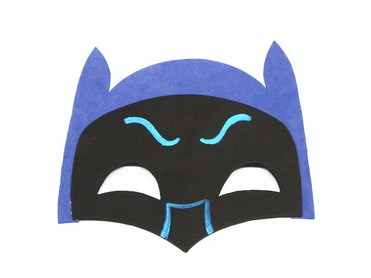 Una vez recortadas todas las partes de la máscara, una de color azul oscuro y otra en negro, las pegamos con un poco de cola de contacto y añadimos el elástico a la máscara.