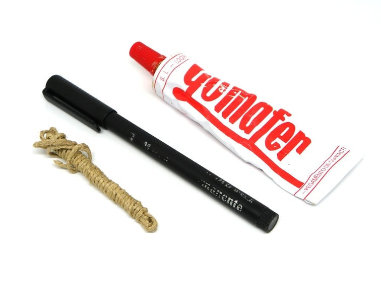 Cuando estemos enrollando la cuerda, echamos un poco de pegamento de contacto por una cara, así quedará mejor adherida la cuerda y no necesitaremos hacer ningún nudo para sujetarla.