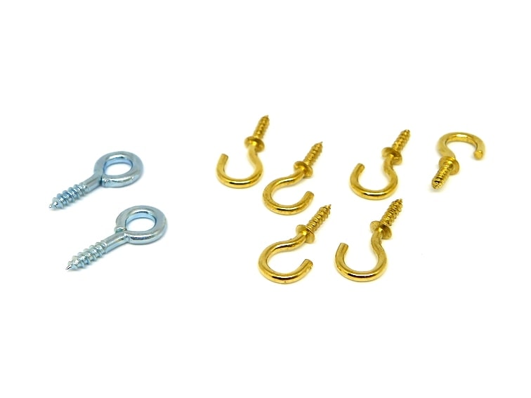 Seguidamente, en la parte del ancho superior del listón colocamos una hembrilla cerrada en cada extremo. De cada una de estas hembrillas que hemos enroscado en la madera, anudamos un trozo de cuerda de unos 25 cm de longitud con el nudo Clinch, por ejemplo. Esto nos servirá para colgar el porta llaves una vez terminado.