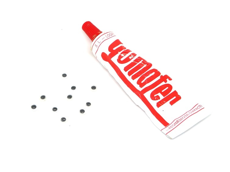 Ya por último, vamos a pegar en cada pez un ojo móvil. Estos pequeños ojos ya tienen un poco de adhesivo, pero para que aguante más tiempo pondremos un poco de cola de contacto en el ojo móvil, y así nos garantizamos que dure más tiempo adherido, ya que los peces se mojaran.