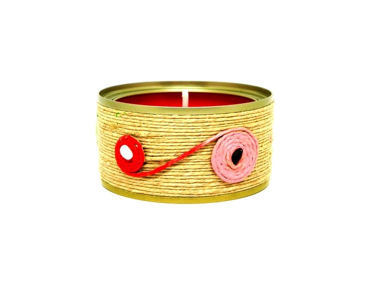 Tras esto, ya tenemos lista la vela decorativa reutilizando una lata de conservas, y que hemos decorado con cuerda de yute en combinación con otros materiales.