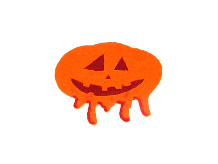 Una vez recortada la figura de la calabaza, se recortan los ojos, la nariz y la boca sangrienta, para, posteriormente, recortar con fieltro de color rojo el contorno de cada parte del rostro de la calabaza malvada. Una vez recortadas todas las figuras, vamos utilizar otros materiales para añadir más detalles detalles a cada figura.