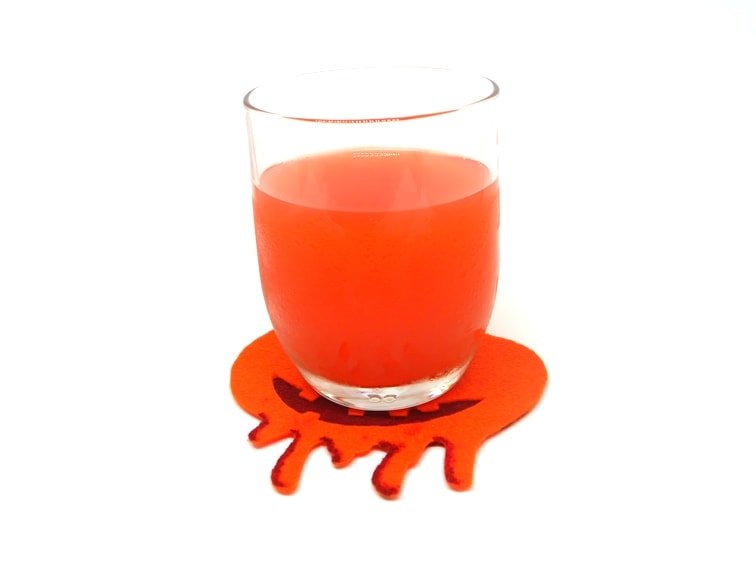 Ya por último, para la calabaza vamos a utilizar fieltro de color rojo para hacer los ojos, la nariz y la boca sangrienta. Todas estas pequeñas partes que añadimos para que tengan más detalles los posavasos, las vamos a pegar con pegamento de contacto.
