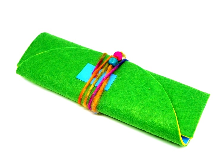 Tras este último paso, ya tenemos listo nuestro estuche plegable hecho con goma eva de colores y una plancha de fieltro. Al combinar estos materiales podemos hacer un estuche en diferentes tamaños, en una gran variedad de colores y con múltiples diseños.