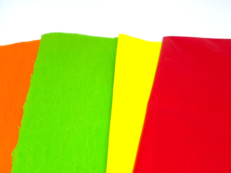 A continuación, vamos a empezar a recortar tiras de papel de seda y de papel crespón de distintos colores con la misma longitud y diámetro que el cilindro de cartón que estamos reciclando.
