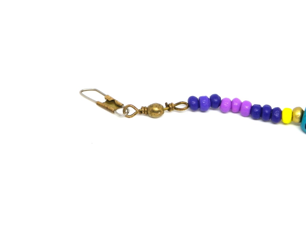 Se puede poner un teléfono de contacto y el nombre del niño o la calle del domicilio, por ejemplo. Seguidamente, colocamos otra secuencia de cuentas de colores siguiendo el mismo patrón o variándolo.