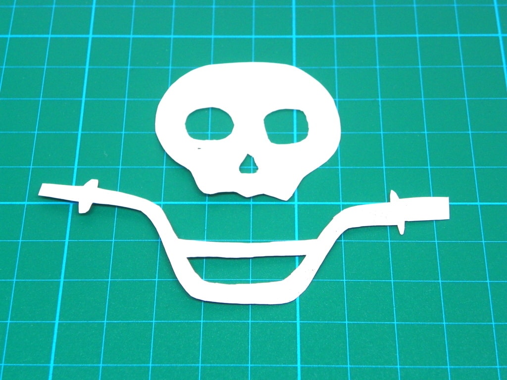 Luego, en vez de hacer las típicas tíbias o espadas que acompañan a la calavera, vamos a dibujar un manillar de bicicleta, de este modo vamos a dar un toque distinto y original a la plantilla para hacer, posteriormente, la bandera pirata que podemos colocar en la bicicleta.