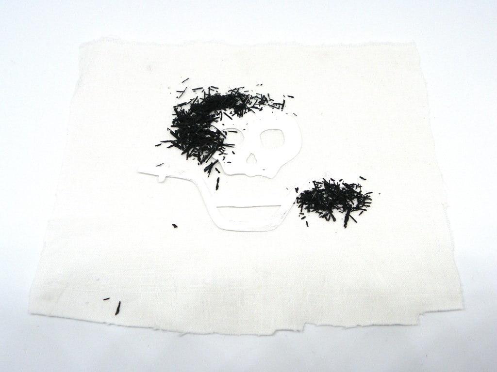 Una vez hemos echado las virutas por todo el contorno de la calavera, pondremos un par de hojas de papel muy despacio sobre la plantilla y las virutas.