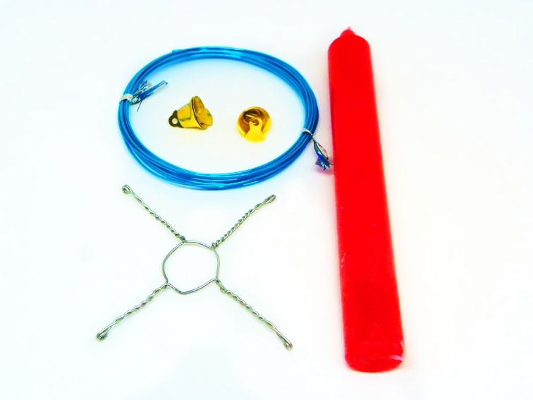 A continuación, con alambre para manualidades que sea de algún color vivo lo iremos introduciendo por cada uno de los cuatro agujeros de los extremos del bozal y colgaremos intercaladamente algún adorno navideño como unas campanillas.