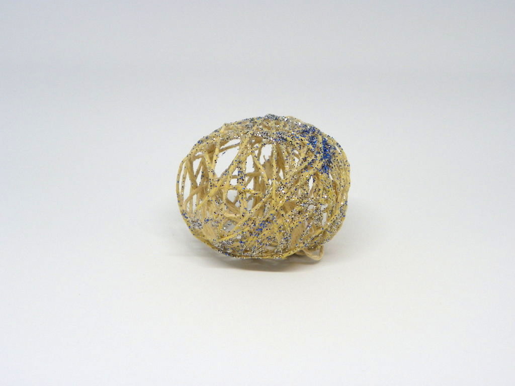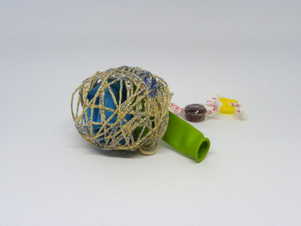 Seca la cola blanca, la estructura de la bola ya estará más sólida y será más resistente. Ahora es el momento que quizás a muchos de los niños les guste más y es explotar el globo que queda dentro del interior del armazón de cuerda.