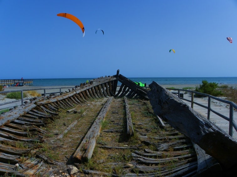 Al otro lado del muelle encontramos varado en la arena y semi enterrado una antigua Gabarra y justo delante vislumbramos la playa del Pinet.