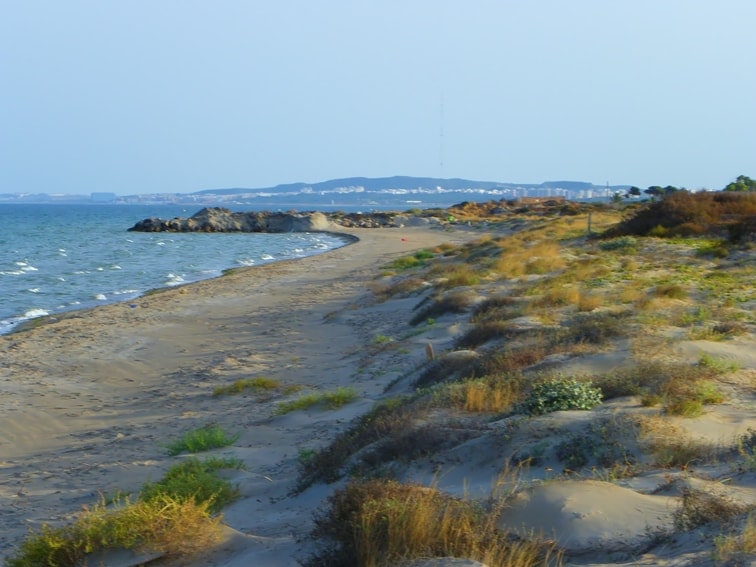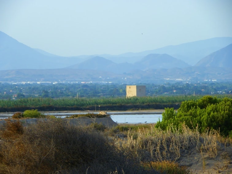 Mientras tanto, podemos contemplar las características del sistema dunar a nuestra derecha. Son dunas móviles paralelas a la línea de costa con escasa vegetación. Justo detrás, las salinas y la torre vigía del Tamarit que data del siglo XVI.