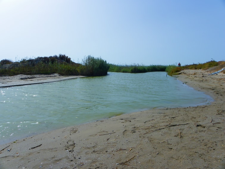 Tras caminar un buen rato, nos encontramos con la desembocadura del río Vinalopó, es una desembocadura pequeña, estrecha y poco profunda. Una vez en la desembocadura, nos detenemos para guardar todas las cosas en la mochila y para observar la vegetación dunar.