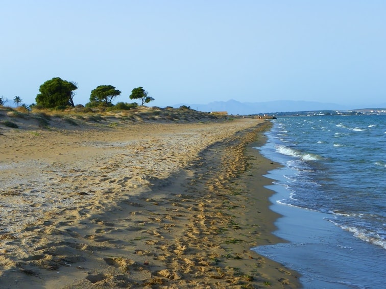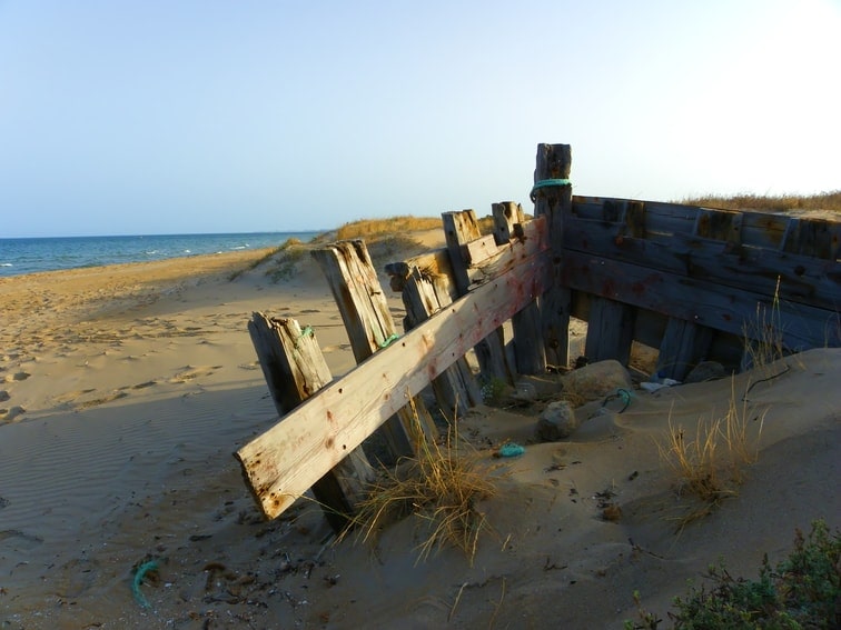 Una vez en la playa del Pinet, podemos ver como asoman por las dunas algunos pinos piñoneros y pinos carrascos que se retuercen al nivel del suelo. Siguiendo nuestro camino, llegamos hasta a la entrada del Parque Natural que es una puerta de troncos secos.
