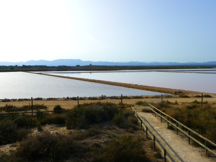 Ya desde un primer momento, contemplamos unas pequeñas dunas móviles y unos cientos de metros detrás de las dunas, observamos las balsas salineras del Parque Natural de las Salinas.