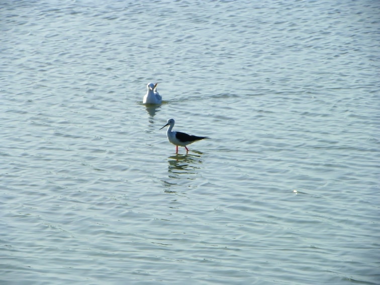 Algunas de las aves que hemos podido ver son los flamencos, charrancitos, gaviotas y patos cuchara, entre otras aves. Pasado un tiempo contemplando el entorno desde la torre de observación que cuenta también con carteles informativos, vemos a lo lejos lo que parece una pequeña caseta de observación pegada justo a una balsa en la que se encuentran una gran variedad de aves.