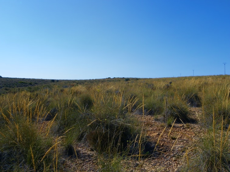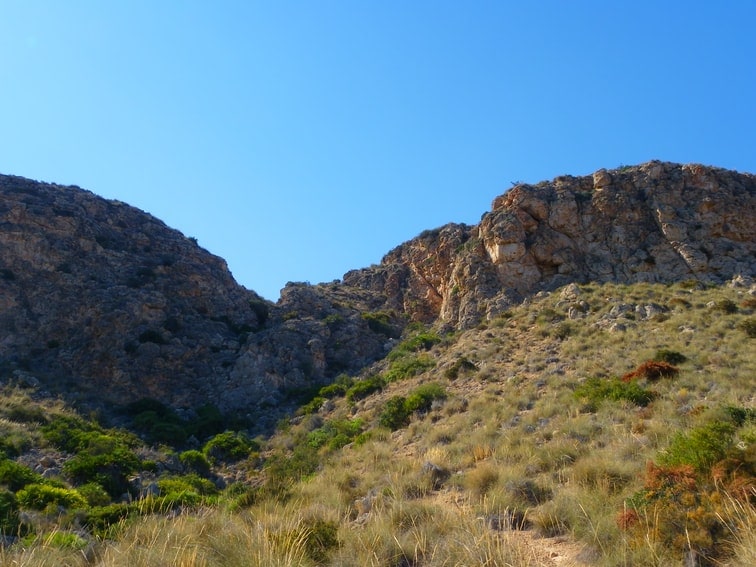Tras dicha parada, seguimos subiendo por la loma. Es un camino muy pedregoso con muchos arbustos pequeños como el esparto y el palmito.