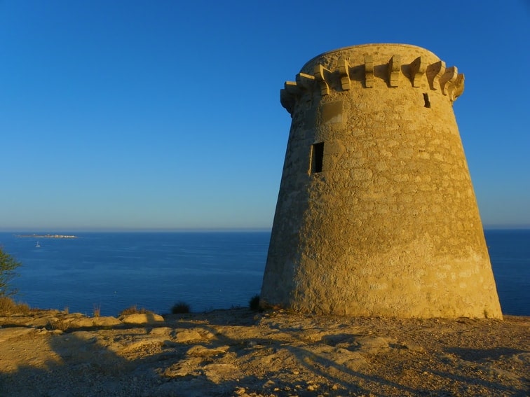 Tras llegar a la torre vigía, hacemos un último parón para contemplar esta estructura desde la cual tenemos, una vez más, una vista de la isla de Tabarca y una panorámica de la bahía y de algunas crestas del arrecife coralino fósil de Santa Pola.