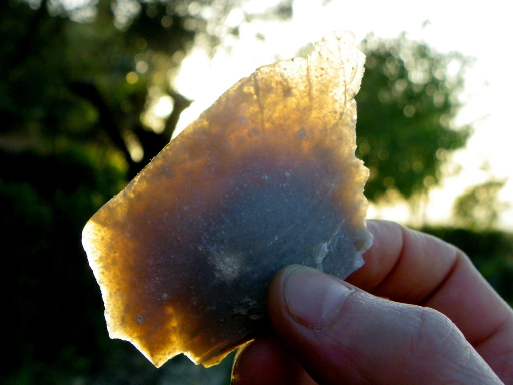 Otra peculiaridad de esta roca es que, las aristas son translúcidas. Asimismo, con los pequeños trozos obtenidos de la talla de esta roca, si los dejamos caer, escucharemos un sonido muy similar al de un cristal cuando cae al suelo.