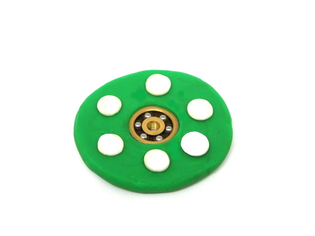 Una vez hecha la forma circular del Spinner con la plastilina, utilizaremos otra herramienta de moldear para vaciar y dejar unos orificios en los cuales introduciremos unas bolitas de plastilina de otro color que añadirá más peso.